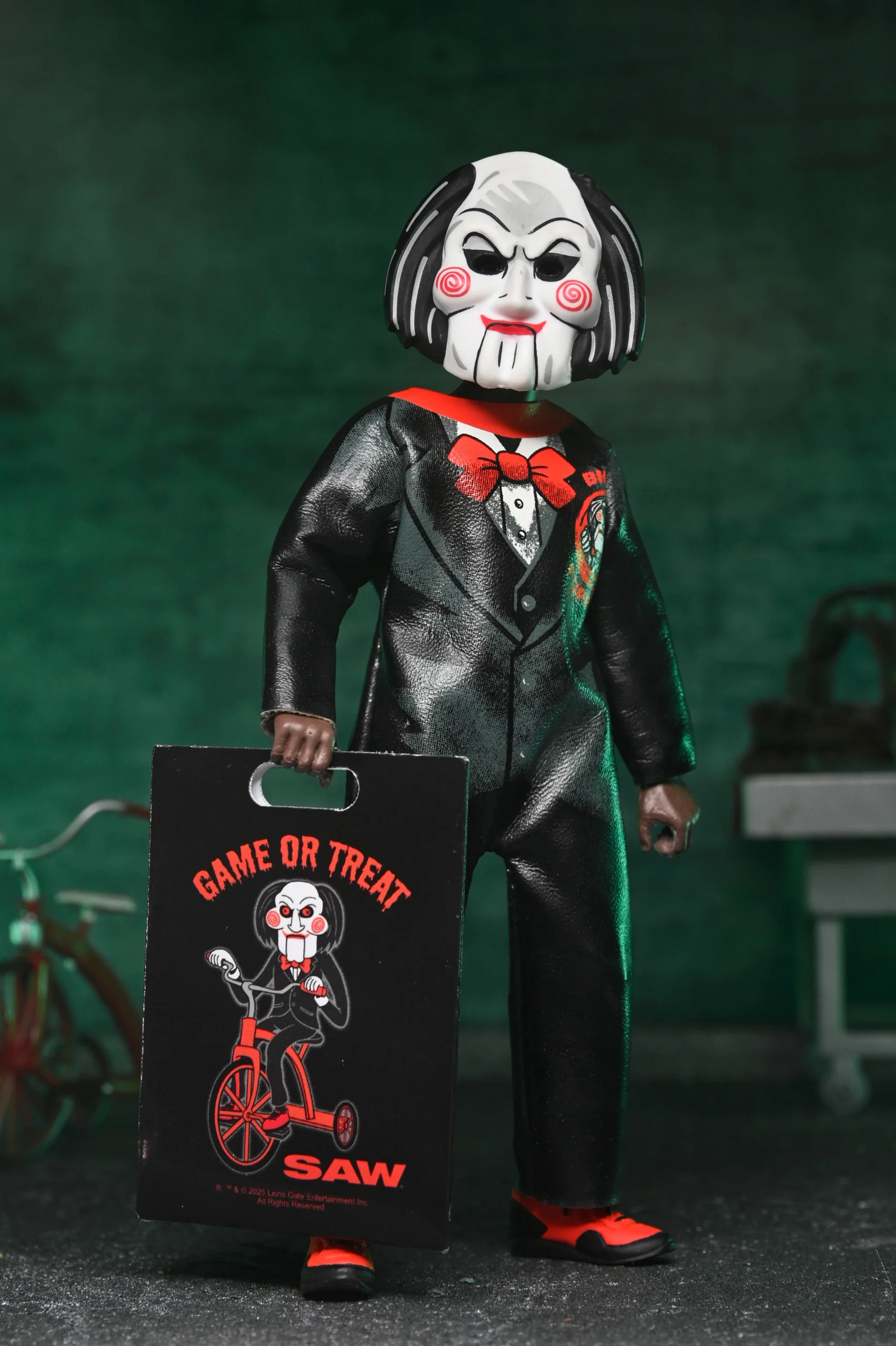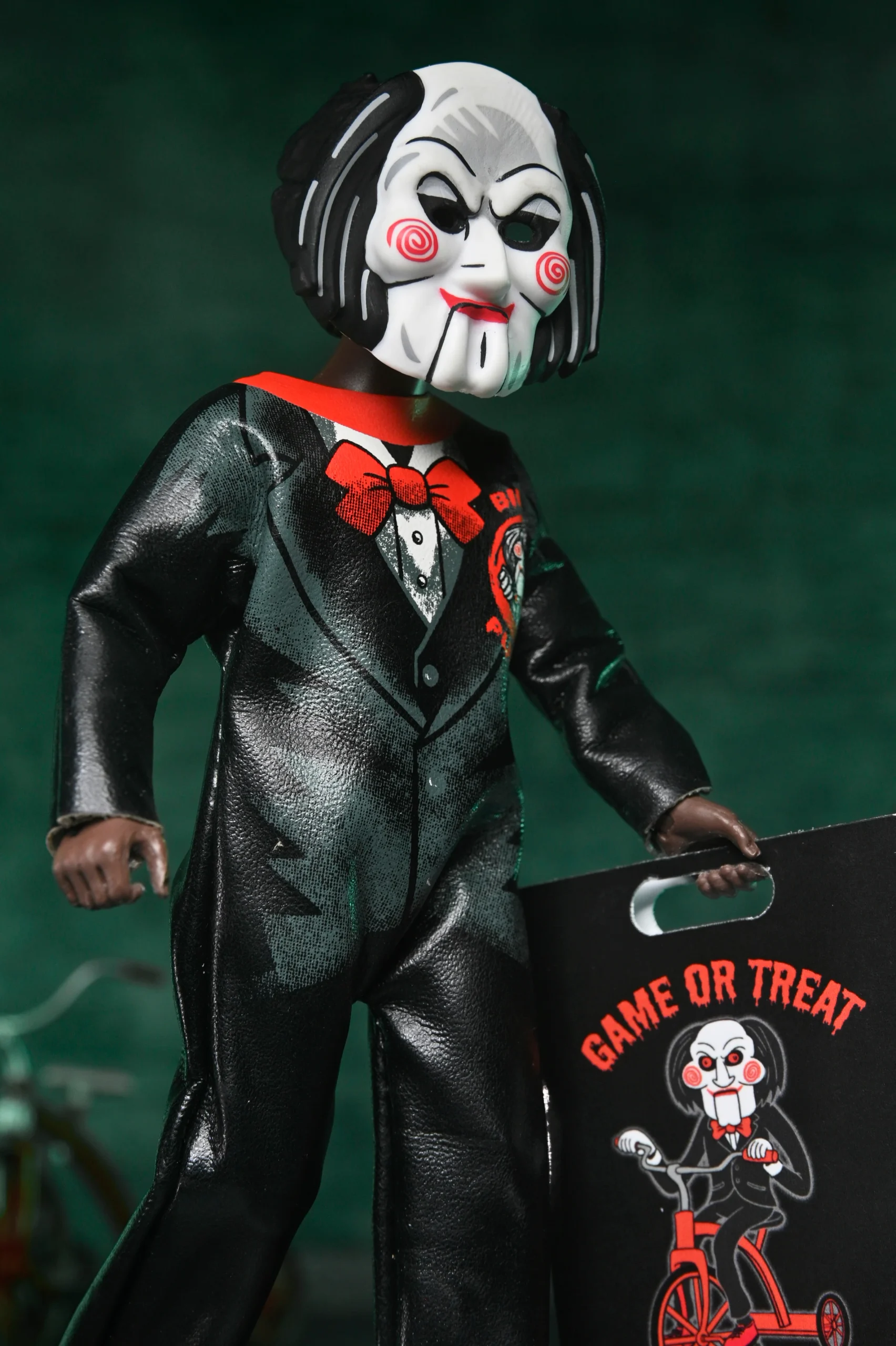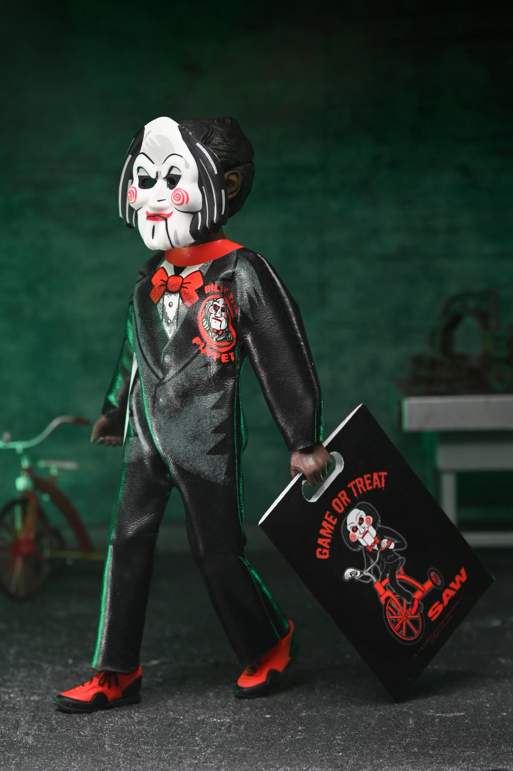 NECA’s 6” Ben Cooper–style SAW figure reimagines Billy the Puppet as a vintage Halloween costume collectible, complete with retro mask design and classic throwback packaging.
