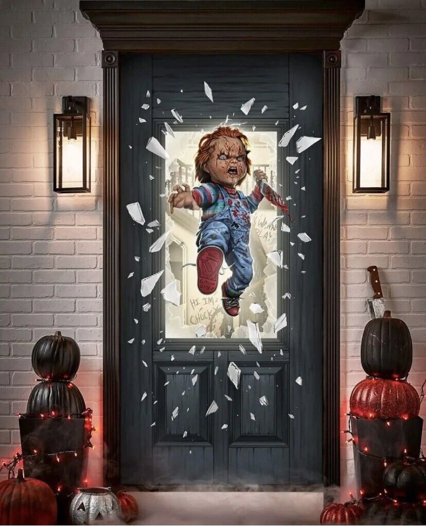 Featuring bold, full-colour artwork of Chucky in all his blood-stained glory, this durable door cover adds instant horror to any home, party, or haunted attraction. Whether you’re decking out your house for Halloween night, throwing a Child’s Play–themed bash, or just showing your love for slasher cinema, this is the perfect way to make a big impression.