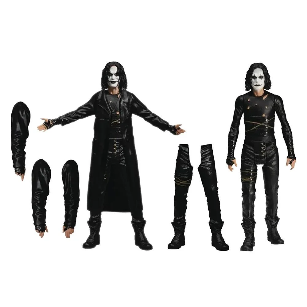 Eric Draven appears in his signature overcoat and includes interchangeable arms, allowing collectors to recreate his iconic outstretched pose from the film, along with an additional right pointing arm. An interchangeable smirking head portrait is included and is compatible with both figures.
