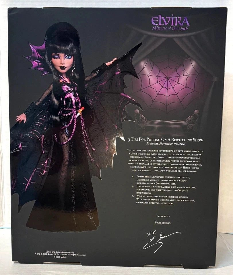 Standing 10.5 inches tall, the Skullector Elvira is fully articulated, allowing for a wide range of display poses. She arrives in exclusive SDCC 2025 packaging, featuring gothic artwork and collector-friendly window box design. Whether displayed in-box or removed to join other Monster High dolls, Elvira commands the spotlight.