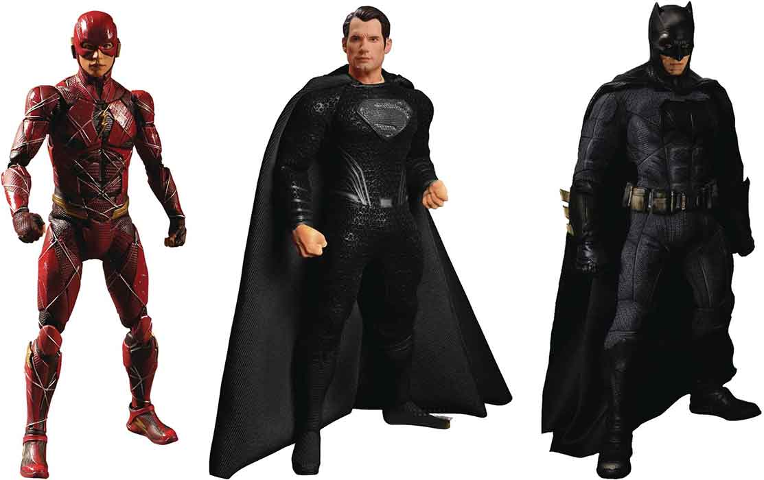 Mezco One:12 Collective Snyder’s Justice League Deluxe Steel Box Set—Batman, Superman & Flash in articulated 1:12 scale, with hero-specific head sculpts, accessories and premium steel tin packaging.