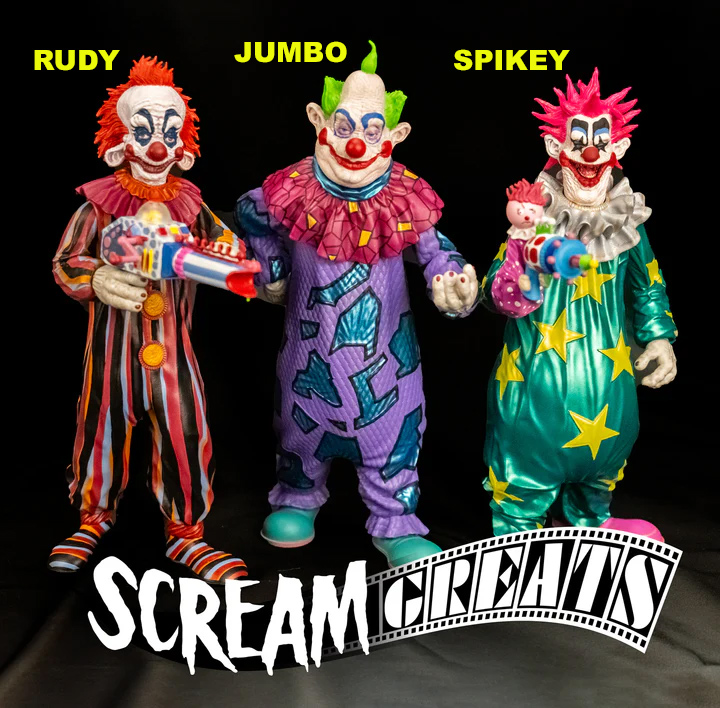 Official Scream Greats set of 3 Killer Klowns from Outer Space action figures (Fatso, Slim, Shorty) by Trick or Treat Studios—8″ scale, multiple articulation, includes cotton candy gun accessories, collector blister pack.