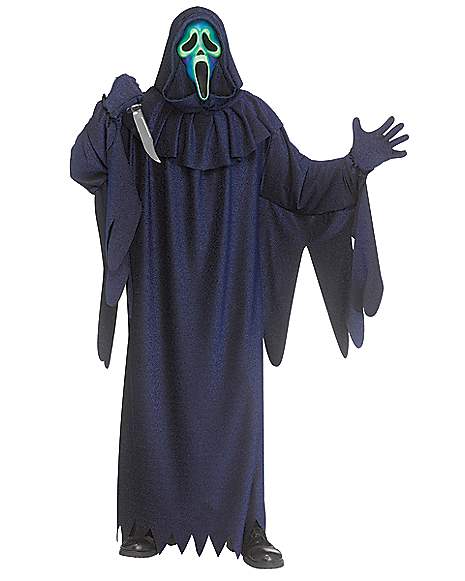 Scream Ghost Face light-up costume by Spirit Halloween. Officially licensed cosplay with blacklight mask, glowing hood, and glittered robe.