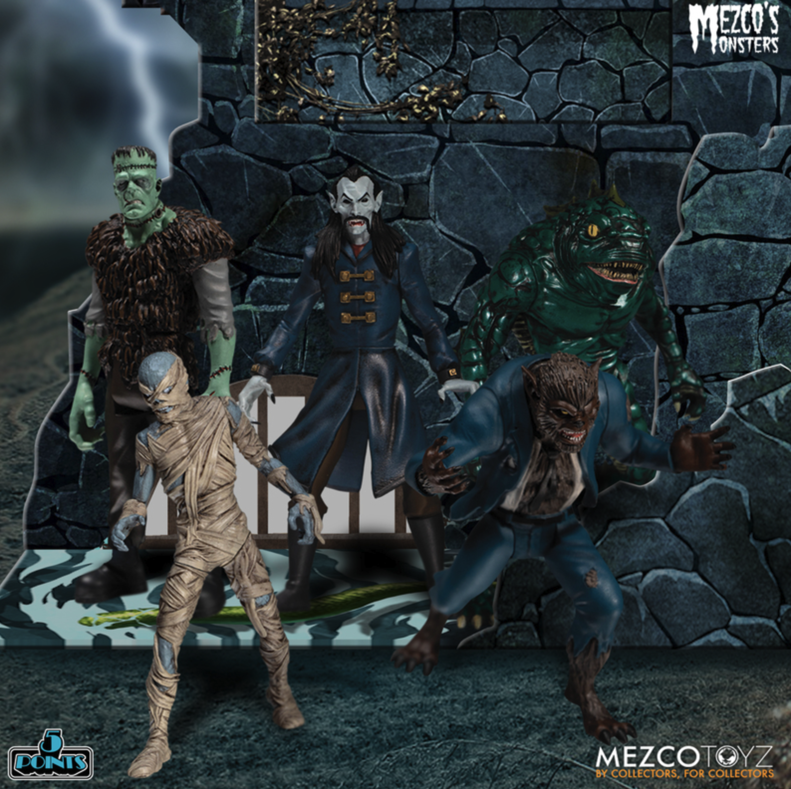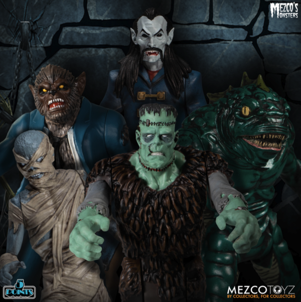 Mezco’s 5 Points Tower of Fear Deluxe Boxed Set includes 5 classic monster figures and an 18” multi-level castle diorama packed with interactive features.