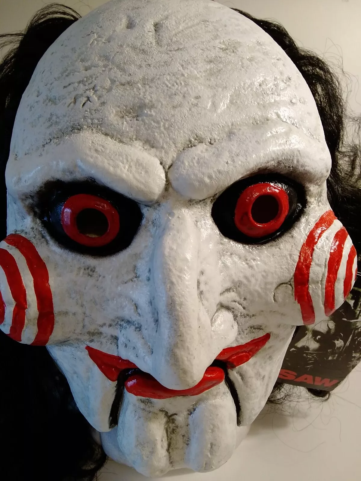 Designed to fit most adults, the mask includes a movable mouth variant (“moving mouth” edition), allowing for a terrifying talking effect at Halloween haunts or horror events. Whether you’re completing a Jigsaw costume, adding a chilling piece to your horror collection, or creating haunting decor, this mask delivers unmistakable cinematic presence.