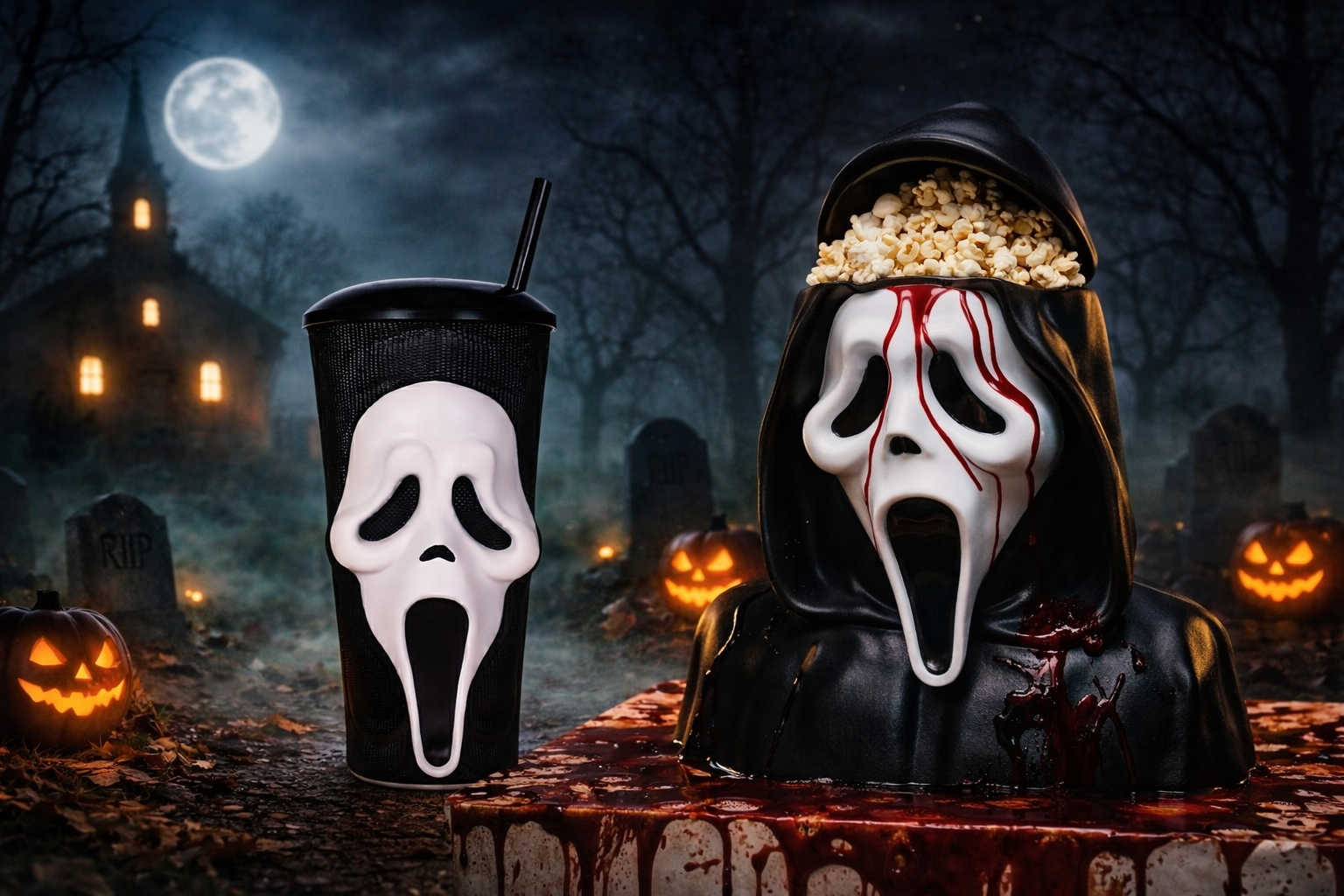 A limited-edition Scream Ghost Face popcorn bucket and cup set, officially licensed and imported from the United States.