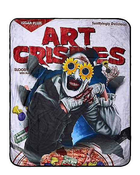 Snuggle up with this terrifyingly delicious Terrifier Art Crispies Fleece Blanket from Spirit Halloween — soft, cosy, and splattered with blood-red horror. Perfect for horror fans and collectors alike.