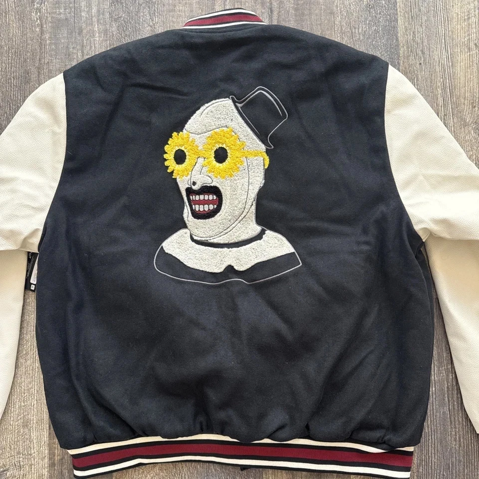 Celebrate modern horror’s most unsettling icon with the officially licensed Art the Clown Varsity Jacket by Spirit Halloween. Inspired by Terrifier, this stylish jacket lets fans show their love for Art the Clown in a wearable, street-ready way.