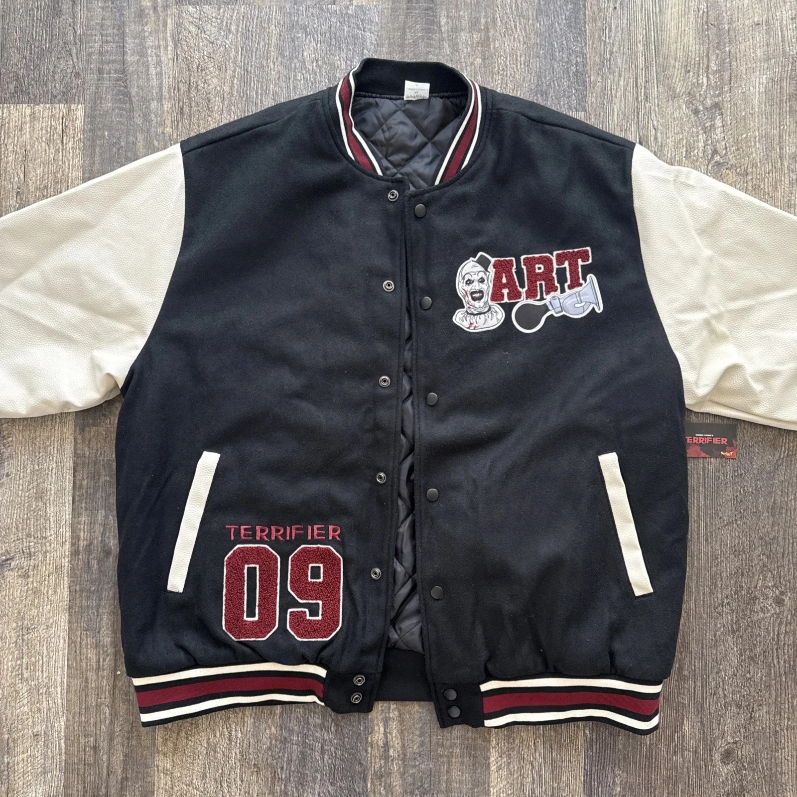 Official Terrifier Art the Clown varsity jacket by Spirit Halloween. Unisex fit. Stylish horror apparel for fans.