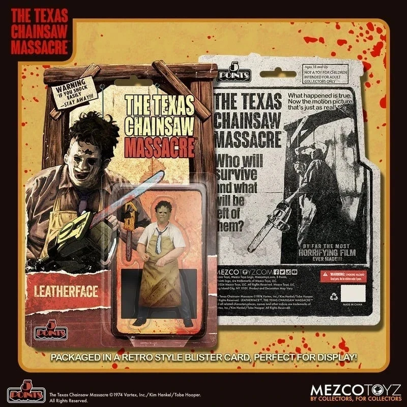 Mezco 5 Points Leatherface action figure from The Texas Chainsaw Massacre. Retro blister card, chainsaw accessory, and classic bloodstained look.
