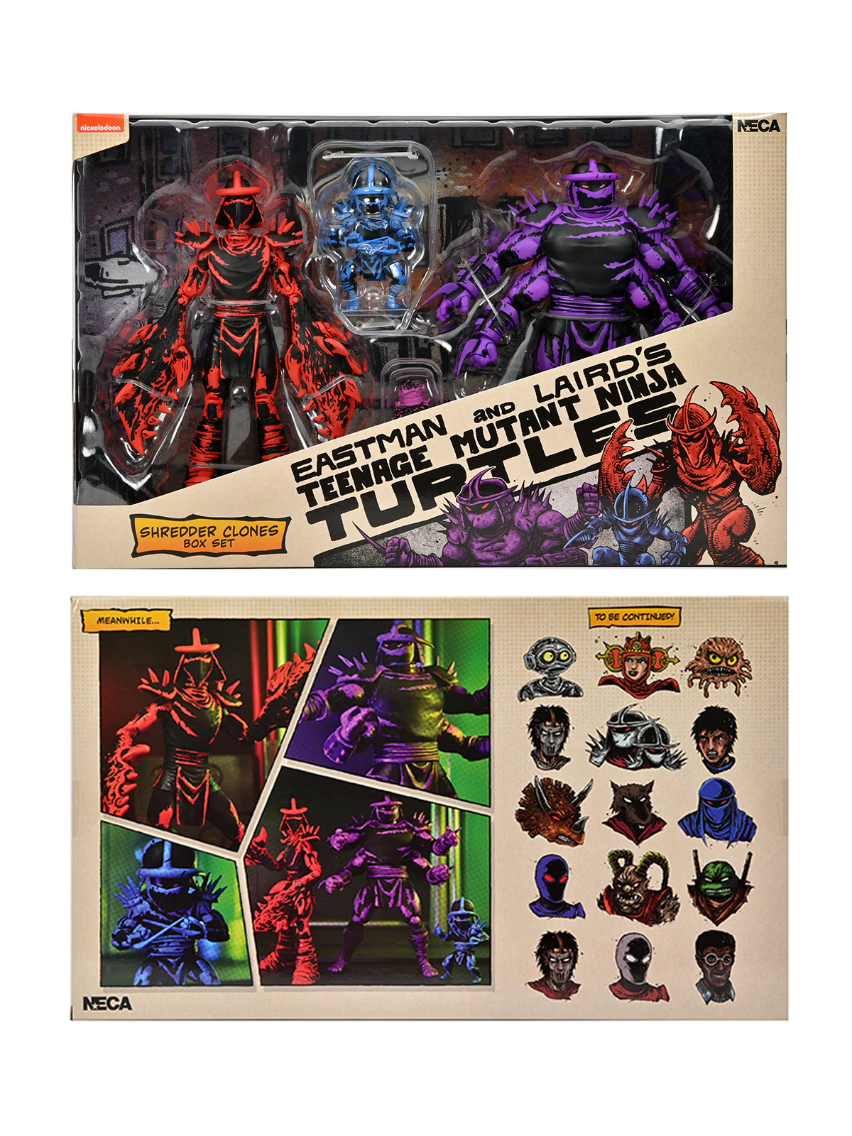 The Shredder Clones are packaged in a special comic-themed window box, illustrated by TMNT co-creator Kevin Eastman, making it a standout collectible for fans of the classic series.