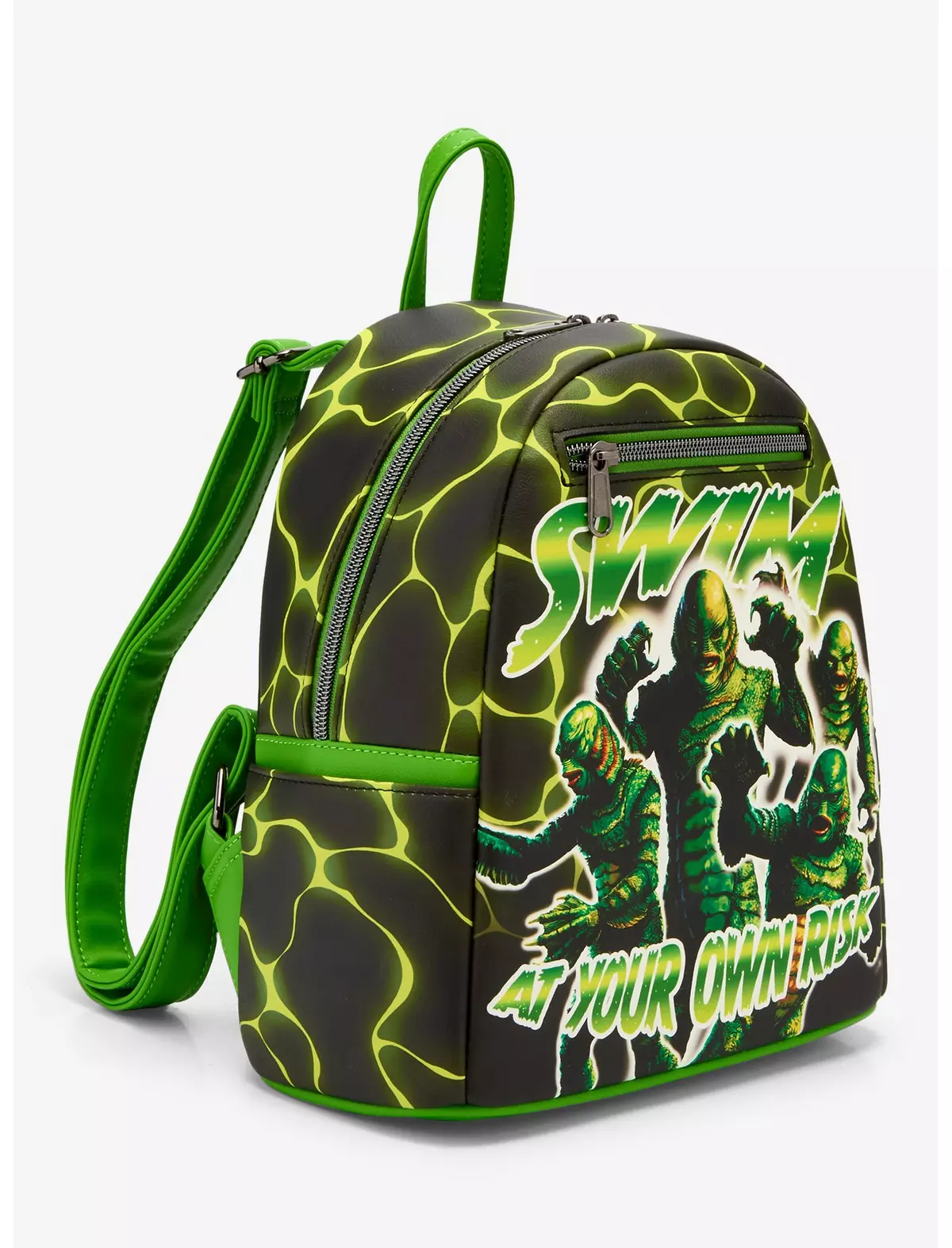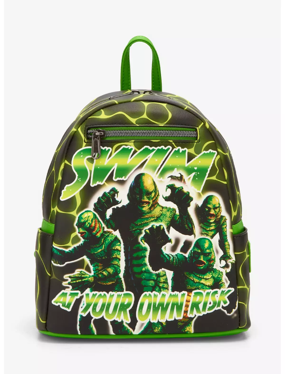 The front showcases a collage of Creature portraits, celebrating the character’s many haunting expressions, alongside the warning text: “Swim at your own risk.” It’s a perfect blend of vintage horror imagery and modern Loungefly design.