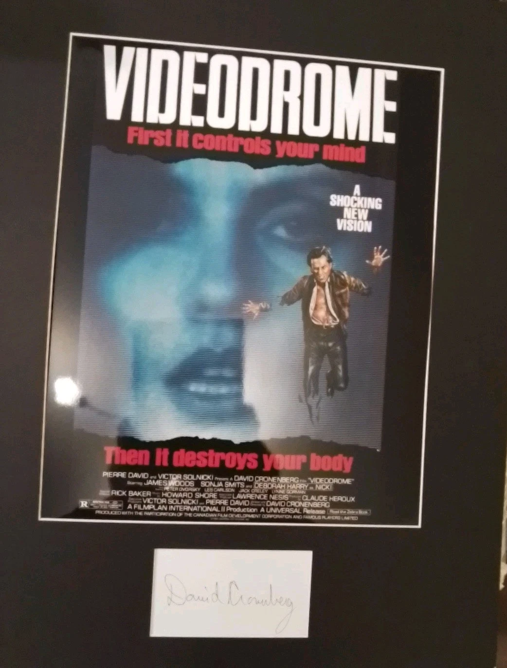 A striking collector’s display featuring a Videodrome one sheet reproduction poster, paired with a genuine David Cronenberg autograph mount — an essential piece for fans of cult cinema and body horror.